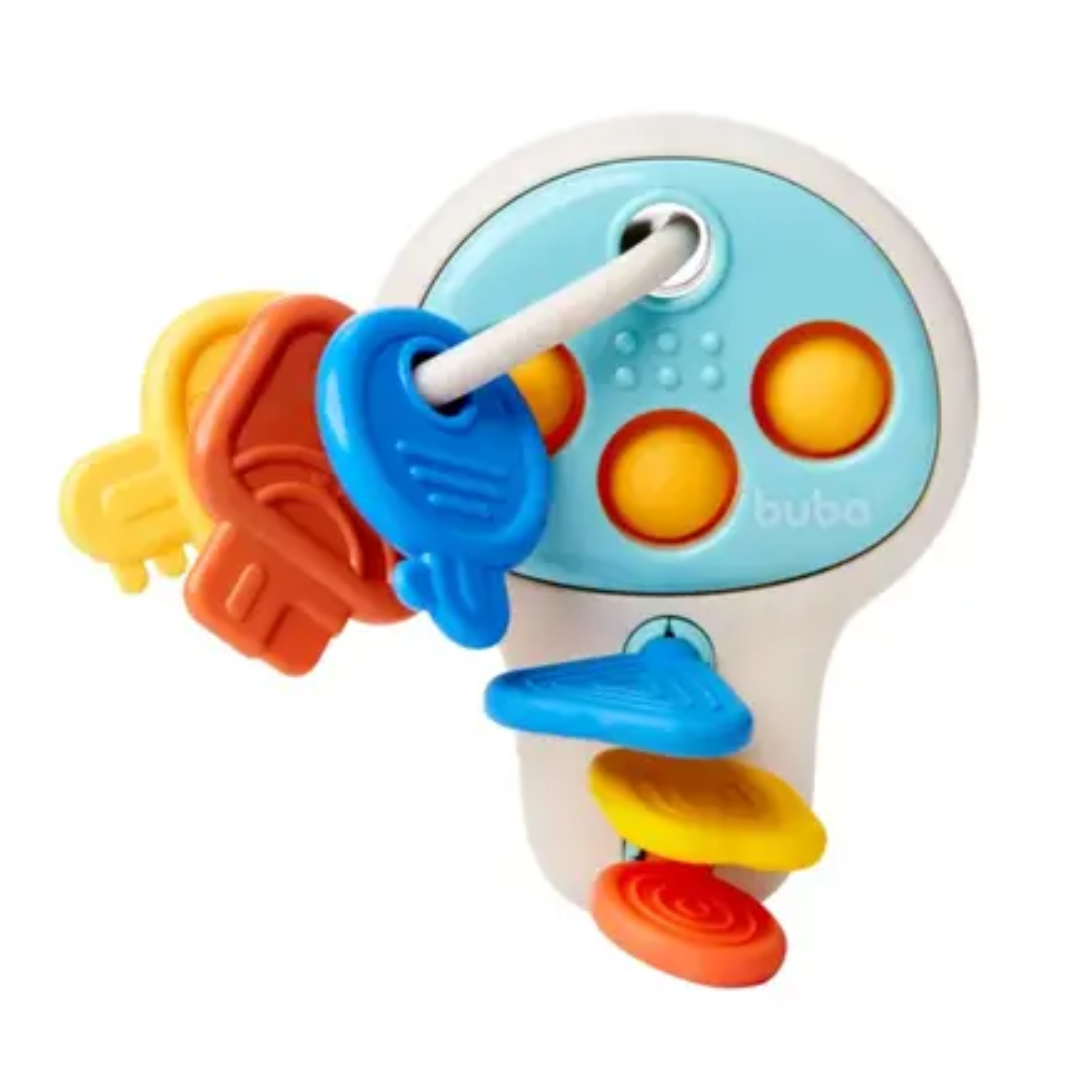O Chaveiro Sensorial da Buba é um brinquedo divertido e seguro, ideal para crianças a partir de 12 meses. Ele combina diferentes estímulos em um só produto: mordedor de silicone macio, bolhas estilo pop it para apertar e peças que imitam chaves de verdade. Estimula o tato, a coordenação motora e a curiosidade dos pequenos. Perfeito para entreter e acalmar os bebês em casa ou durante os passeios.