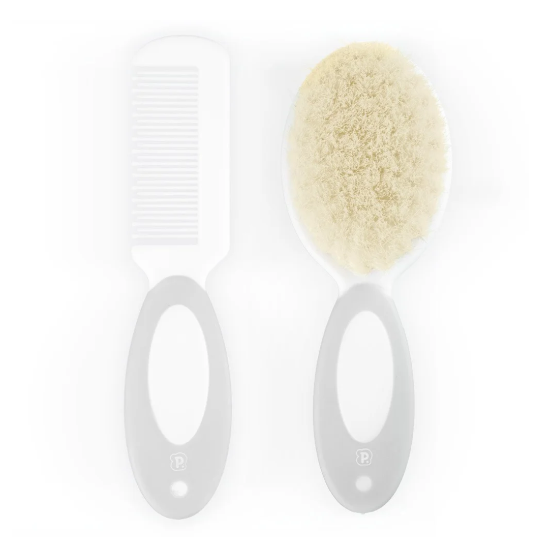 O kit é composto por uma escova de cerdas macias e naturais confeccionadas em lã, e um pente que auxiliam os cuidados do bebê na primeira infância.