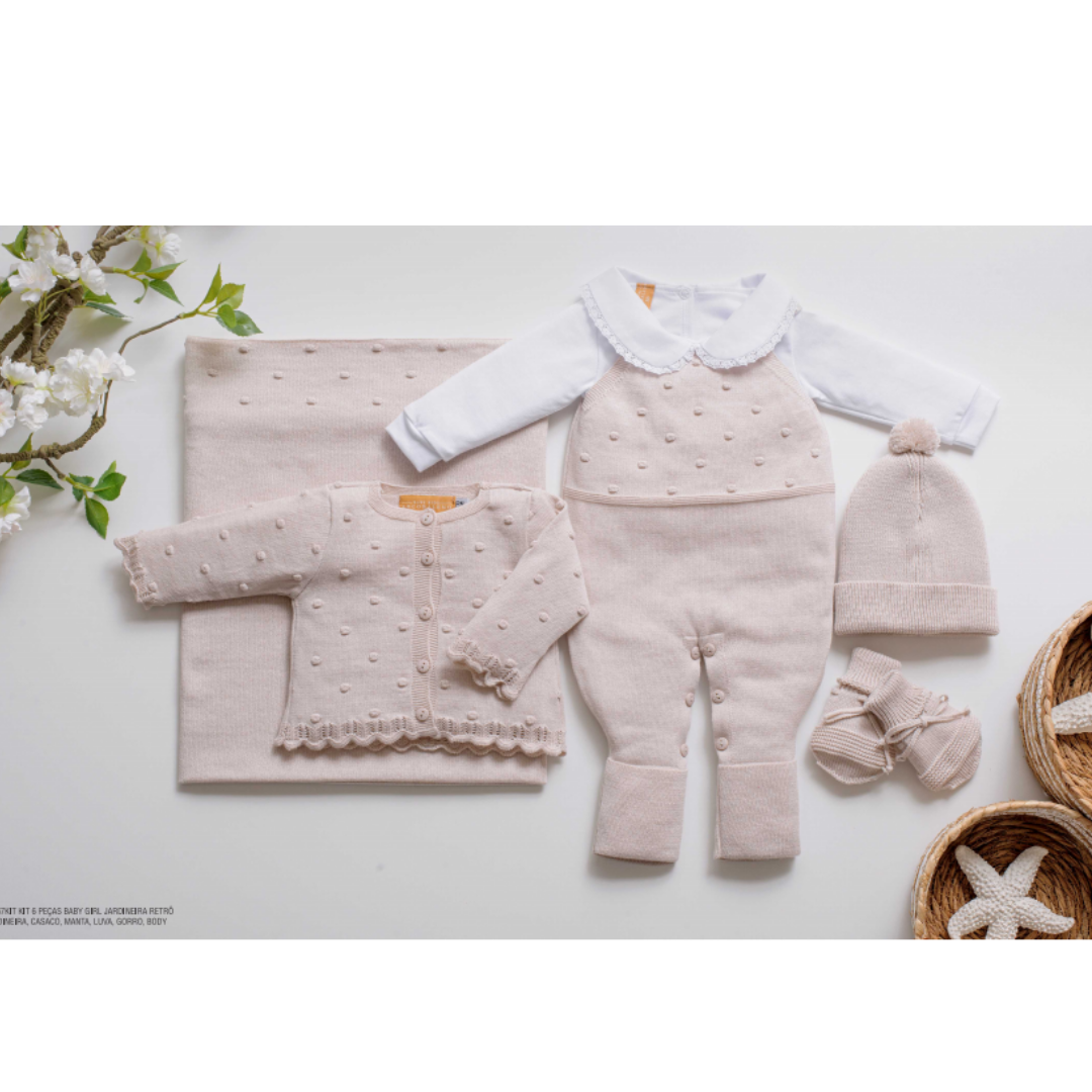 Kit com 6 peças: jardineira, casaqueto, body com gola bordada, manta, gorro e luvas.