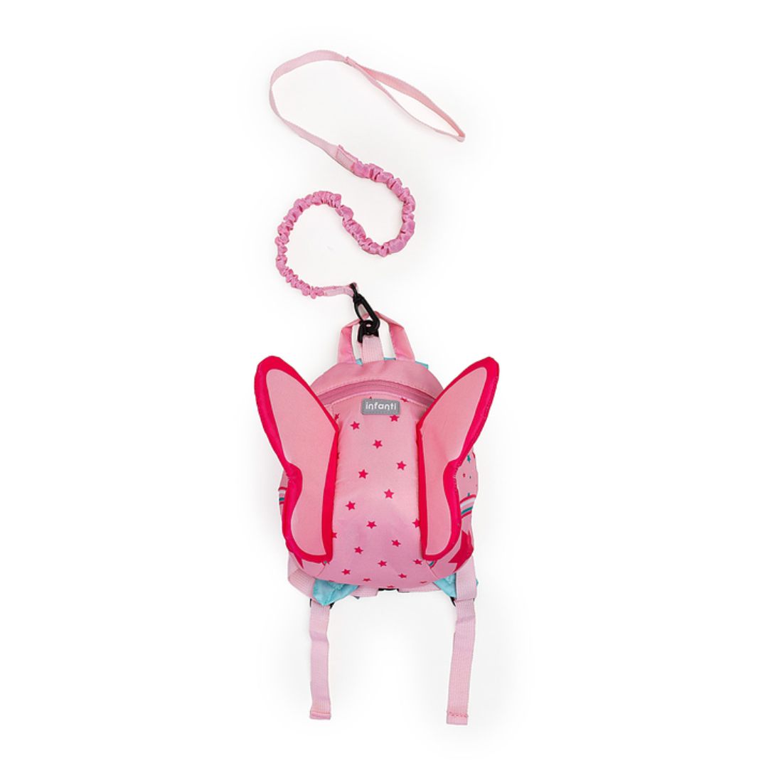 Colorida e com abertura em zíper, a mochila também pode ser usada sem a guia, para carregar pequenos objetos. Ela é projetada para uso por crianças de 1 a 4 anos.