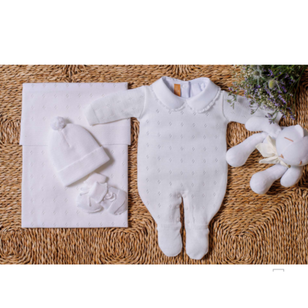 Kit com 5 peças: macacão, body com gola bordada, manta, gorro e luvas.
